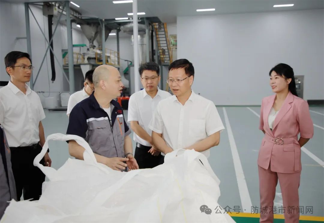 5月15日,市委書記譚丕創到防城港經濟技術開發區開展專題調研,深入查找園區基礎設施建設存在的短板和問題,系統研究破解難題的辦法和舉措。圖為譚丕創在廣西匯金鋰電池新材料項目現場,與企業相關負責人親切交流,詳細了解企業生產經營情況。防城港日報全媒體記者 韋榮合 攝