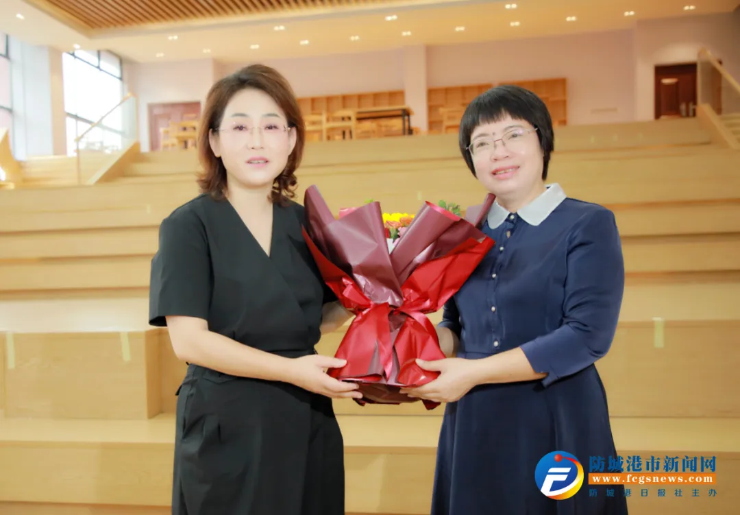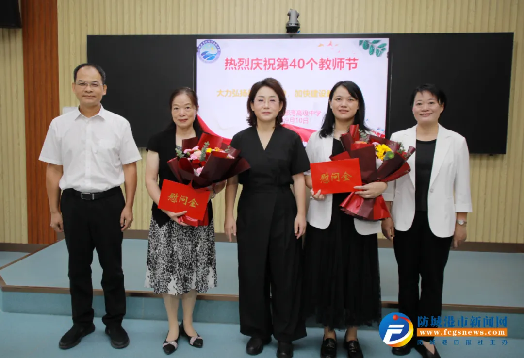9月10日上午,市長黃江走訪慰問辛勤耕耘、默默奉獻在一線的優秀校長和優秀教師代表,代表市委、市政府向全市廣大教師和教育工作者致以節日的親切問候和誠摯祝福。圖為黃江在市北部灣高級中學看望慰問優秀校長代表、市北部灣高級中學校長胡冬梅及優秀教師代表梁寶珠并合影。防城港日報全媒體記者 韋榮合 攝