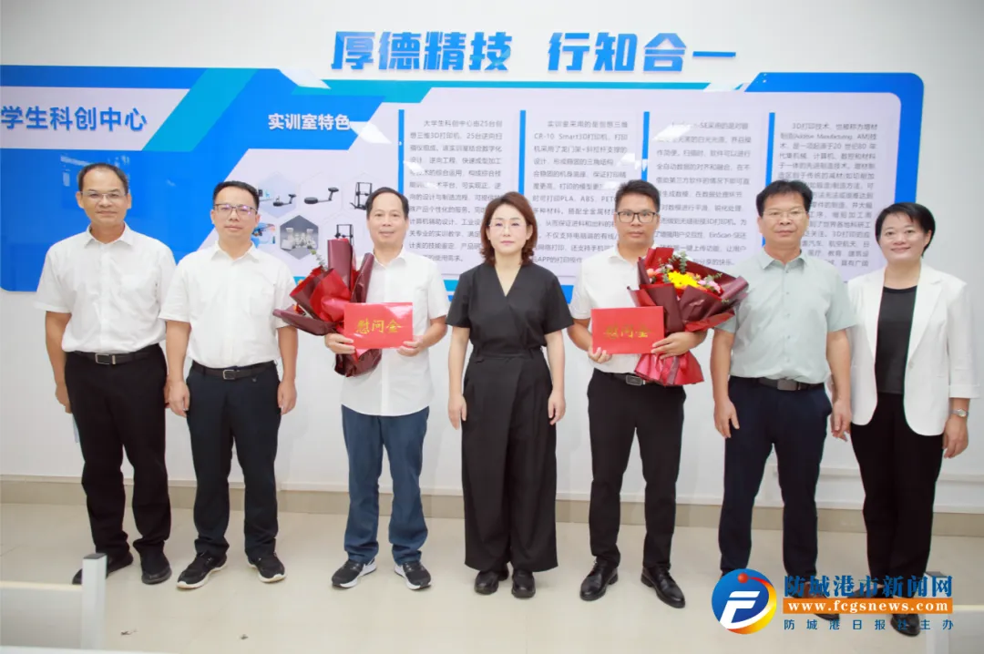 圖為黃江慰問防城港職業技術學院優秀教師代表黃桂遵和市理工職業學校優秀教師代表蘇攀并合影。防城港日報全媒體記者 韋榮合 攝