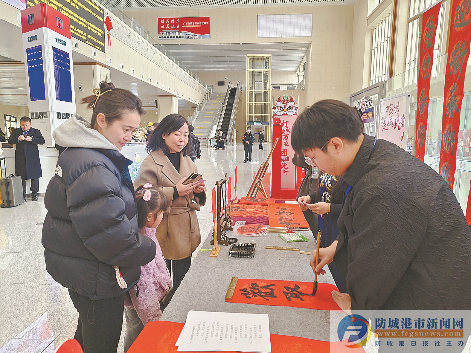 上午10時30分,東興市站內人聲鼎沸,候車室里坐滿了等待歸家的旅客。隨著一曲空靈悠揚的獨弦琴音緩緩響起,旅客們仿佛被瞬間帶入京族文化的神秘殿堂,其獨特的魅力吸引了眾多旅客駐足欣賞。活動現場的一角,書法協會的老師正揮毫潑墨,為旅客現場書寫并贈送春聯,只見書法老師筆走龍蛇,氣勢如虹,不一會兒,一副副滿載新春祝福的大紅春聯和福字便躍然紙上,為旅客們的歸家之旅增添了一份濃濃的節日喜慶。