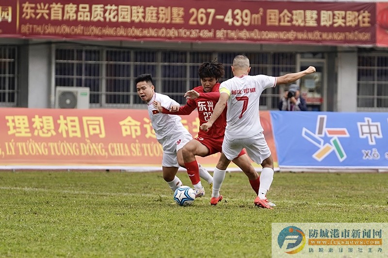 當天上午10時30分,比賽開場哨聲響起,中國東興隊和越南芒街隊雙方隊員展開激情對決。雖然下著蒙蒙雨絲,但球員們?nèi)詿崆楦邼q,在綠茵草地上奔跑、傳球、拼搶、射門,身姿矯健、配合默契,比賽精彩紛呈。