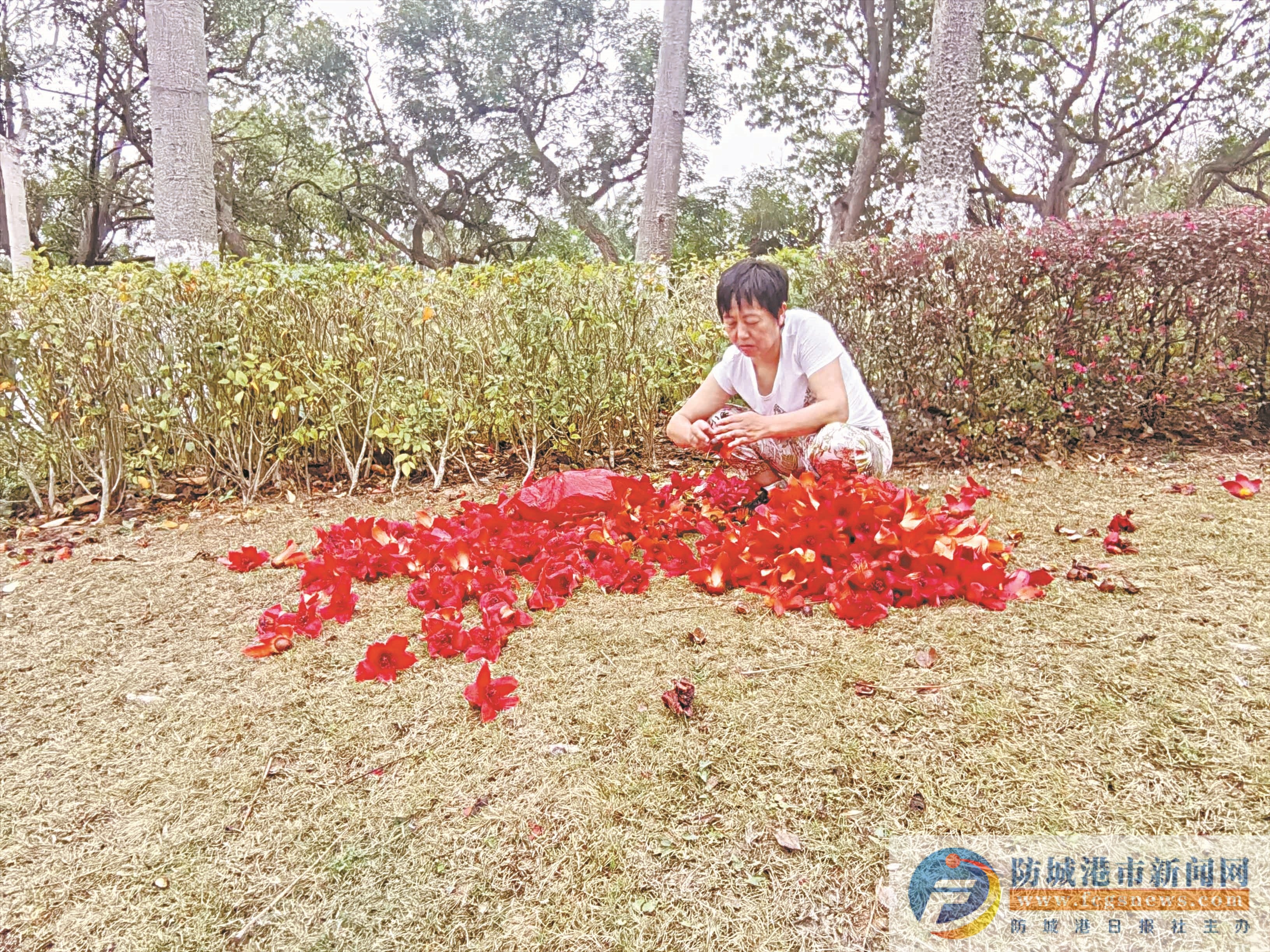 近日,記者在北部灣海洋文化公園看到,木棉花競相綻放,火紅的花朵綴滿枝頭。隨著花朵自然凋落,不少市民沿路撿拾木棉花。木棉花是藥食同源的中藥材,有健脾祛濕、清熱解毒的功效,可入藥、泡水、煲湯、煮粥。