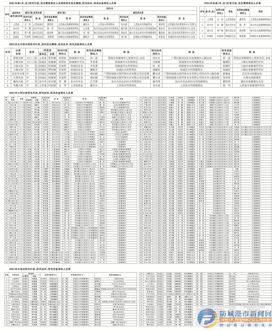 為切實做好2025年防汛抗旱工作,保障防洪安全和供水安全,根據《中華人民共和國防洪法》《中華人民共和國抗旱條例》《水庫大壩安全管理條例》和《廣西壯族自治區水利工程管理條例》的規定,現將防城港市各縣(市、區)防汛(抗旱)行政、安全管理責任人和堤防、水庫(水電站)的防汛行政、安全管理、技術、巡查責任人名單予以公告。