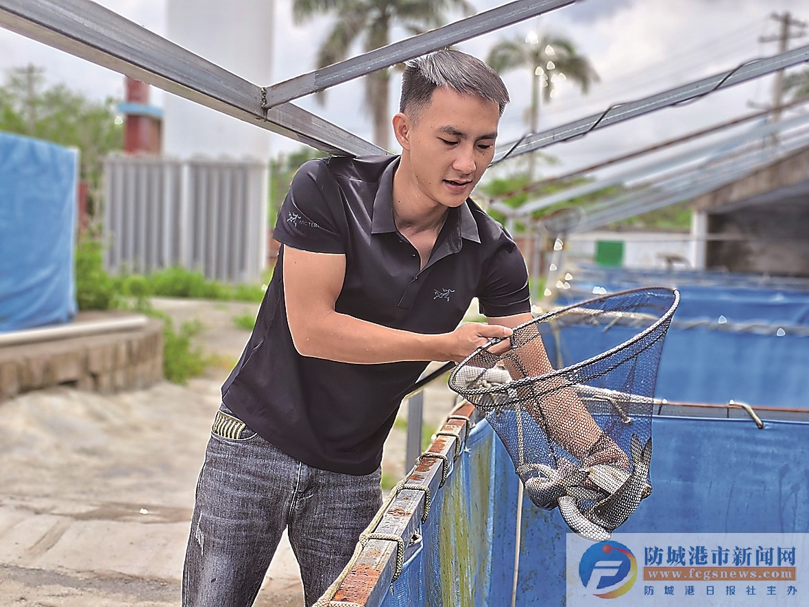 5月14日下午,在防城區華石鎮高密度水產養殖基地內,基地負責人覃宇仁手持撈網,忙碌穿梭于高密度魚池與路基圓桶之間,不時撈起水中的魚兒,仔細檢查它們的生長狀況(見上圖)。