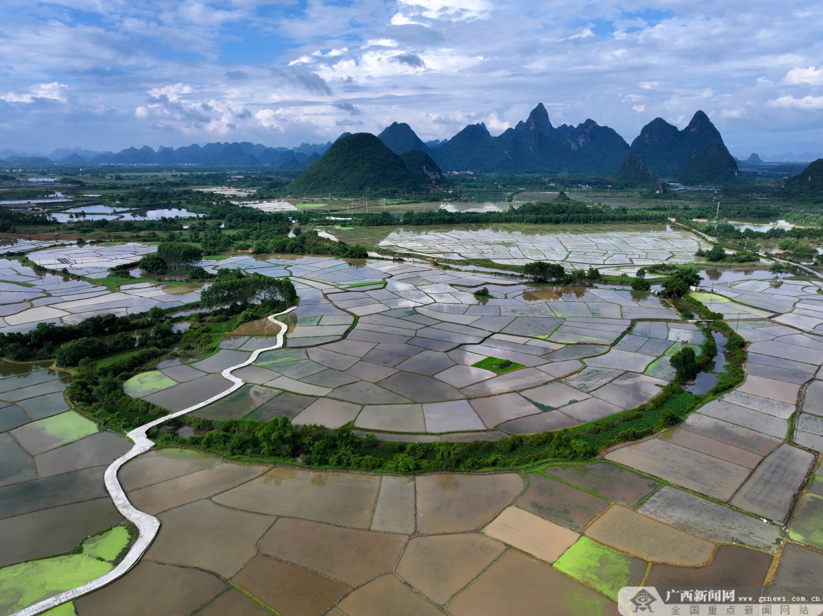 廣西桂林市臨桂區四塘鎮大灣村灌滿水的田塊阡陌縱橫,小路蜿蜒,美不勝收。唐廣東 攝