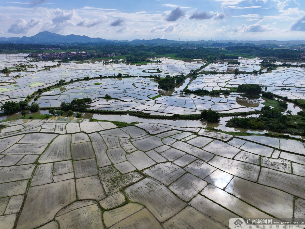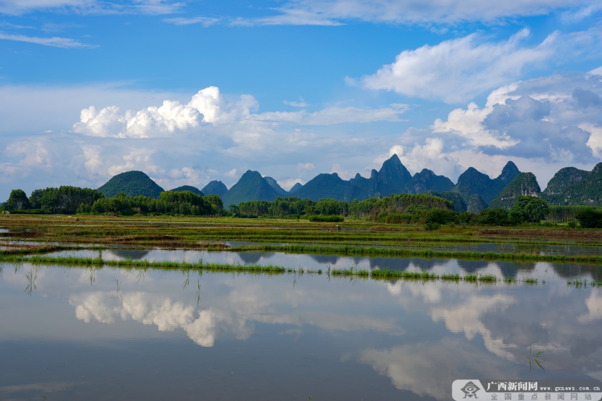 近日,廣西桂林市臨桂區四塘鎮大灣村,千余畝中熟水稻田進入灌水待耕期。藍天白云之下,灌滿水的田塊阡陌縱橫,宛如明鏡,倒映著天空與云影,構成一幅靜謐秀美的田園畫卷,美不勝收。