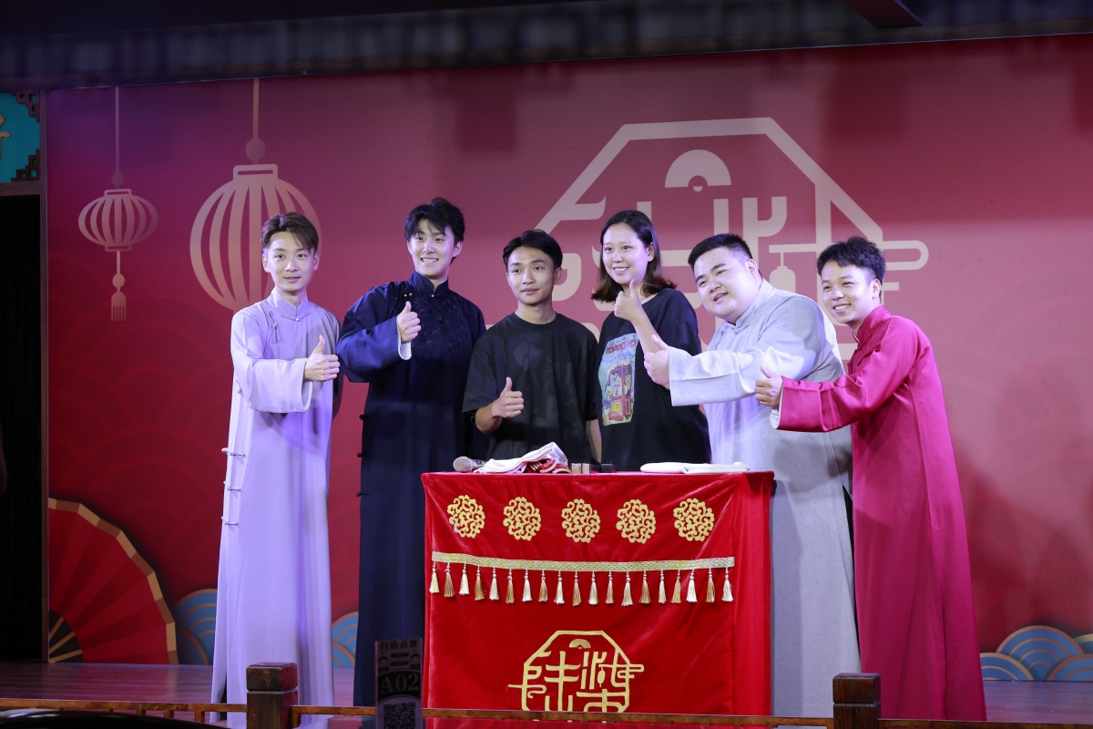 演出結束后,南寧陸柒相聲會館的演員們與觀眾合影互動。記者 覃瀏榴 攝