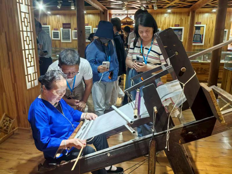 在皇都侗文化村,看國家級非物質文化遺產侗錦織造技藝。