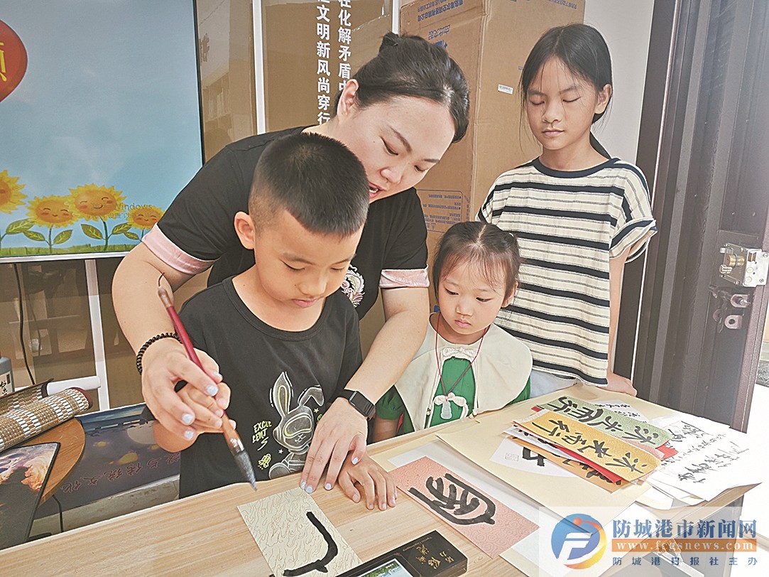 8月1日,市婦聯(lián)、市婦兒中心等單位在防城區(qū)灘營鄉(xiāng)便民服務(wù)中心,開展防城港家庭教育“三支隊(duì)伍”進(jìn)村屯服務(wù)實(shí)踐活動(dòng)。活動(dòng)以《防城港邊境農(nóng)村地區(qū)“三支隊(duì)伍”協(xié)同育人“教聯(lián)體”新模式研究》課題開題為契機(jī),整合本土資源,通過開展系列豐富多彩的活動(dòng),發(fā)揮家校社協(xié)同育人作用,助力改善基層家風(fēng)、鄉(xiāng)風(fēng)、村風(fēng)。圖為老師手把手教小朋友書寫家風(fēng)書法作品。