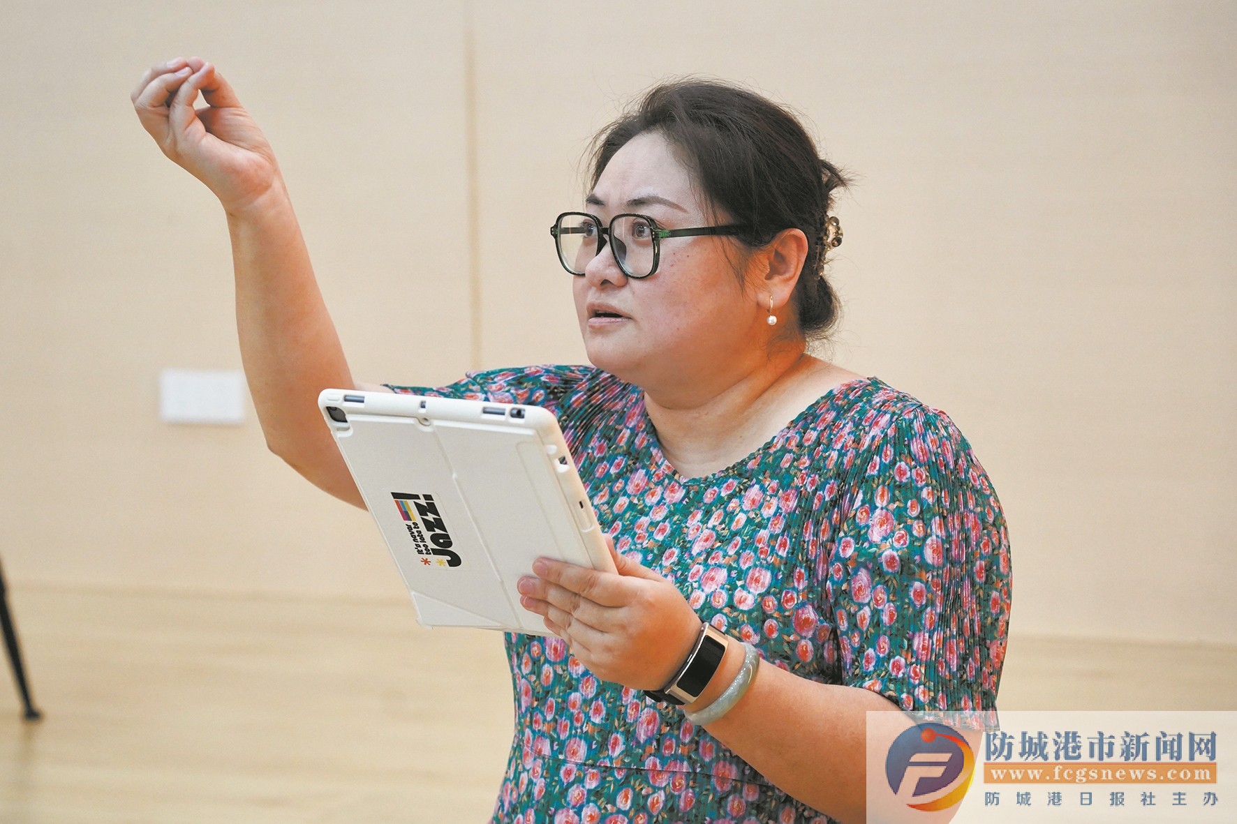 付仁瓊是市高級中學的一名音樂老師,曾參加過兩次廣西基層群眾文藝會演。從三尺講臺到聚光燈下的舞臺,有著豐富經驗的付仁瓊,擔任此次合唱團女高音部的聲部長?!拔沂菨h族人,第一次接觸京語,剛開始簡直無從下手。所以每天投入大量時間練習,只能自己先學會了,才能更好地帶著大家練?!备度虱傉f,連續數小時的高強度排練后,隊員們的嗓子時常沙啞,涼茶成了排練場邊的必備品。她還補充道:“累是真累,但大家都沒有放棄,每一次小進步,都有成就感?!?/p>