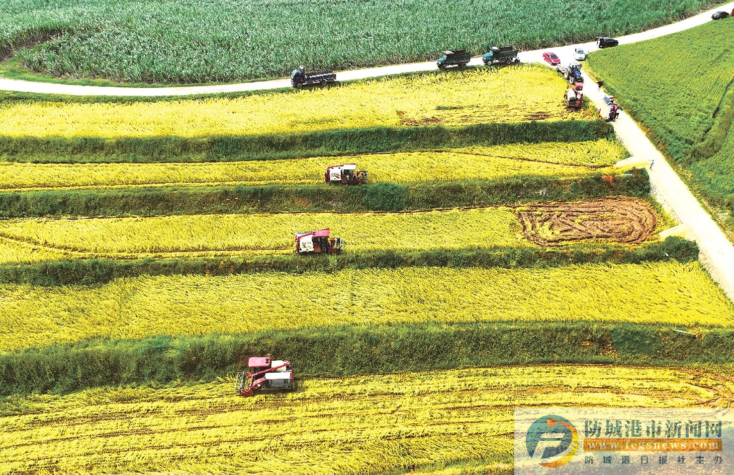 10月9日,上思縣叫安鎮熟康村水稻種植基地里,數臺收割機分散在田間轟鳴作業,忙碌搶收倒伏的成熟水稻,全力減少臺風造成的損失。市農業農村局派出的農技專家在田埂邊,一邊緊盯搶收進度,一邊叮囑農戶做好攤晾防潮,避免稻粒霉變影響品質。